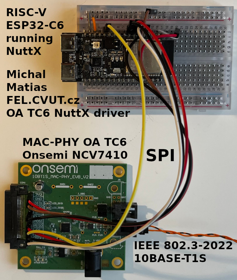 #NuttX Support for IEEE 802.3-2022 10BASE-T1S/L #Ethernet using Open Aliance SPI MAC-PHYs implemented by Michal Matias from #CVUT in frame of #GSoC2025 has been fully merged into NuttX mainline. The common part resides at drivers/net/oa_tc6. #ESP32C6 mapping and mapping for SAVM71-Xplained Ultra are good examples for straightforward extension to other MCU and board NuttX SPI interfaces. The accompanying plcatool for Physical Layer Collision Avoidance parameters configuration matching OA-TC14 specification is another contribution.
