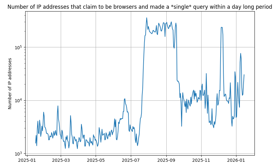 So after the @lwn post on being hammered by scrapers today, I ran an analysis on what I thought was a recent phenomenon: a query from what tries to pass as a browser from an IP address that does exactly *1* query in a 24 hour period. You can't filter an IP address that makes just one visit. Turns out this happens a lot, sometimes 250k unique single use addresses/day!