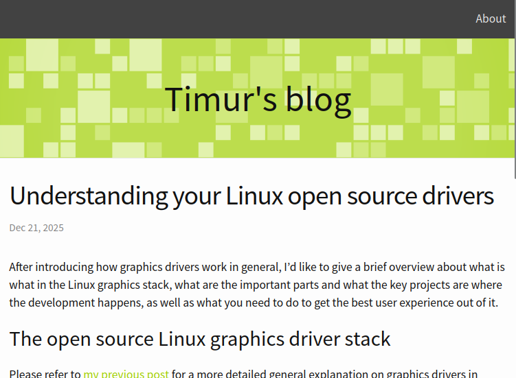 Timur Kristóf writes: ""After introducing how graphics drivers work in general, I’d like to give a brief overview about what is what in the Linux graphics stack, what are the important parts and what the key projects are where the development happens, as well as what you need to do to get the best user experience out of it. […]