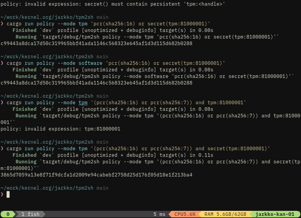 I’m planning to iteratively make tpm2sh policy subcommand to compile policy expressions first into eBPF i.e., --mode ebpf option.