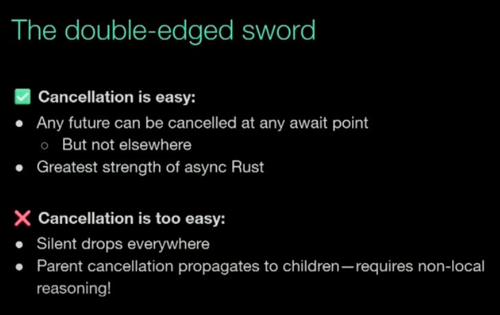 The "double-edge sword" of cancellation in Rust is spot on: on one hand, it's cool how "easy" and simple it is to cancel future in Rust -- you *drop* it. Especially given how non-trivial it can be in synchronous environments.