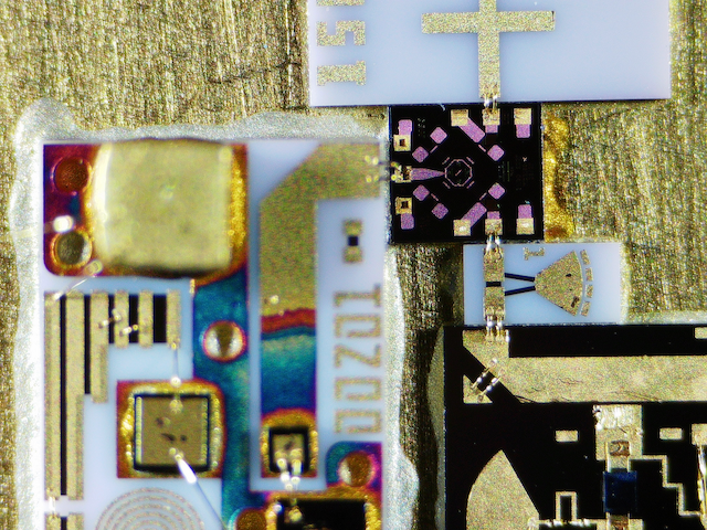 I finally bought a USB microscope and wow does it help with reverse engineering RF circuits. Quite an interesting & surreal world down there, too. This is from a 60 GHz wireless backhaul device. The RF wavelength is about 4.5mm.