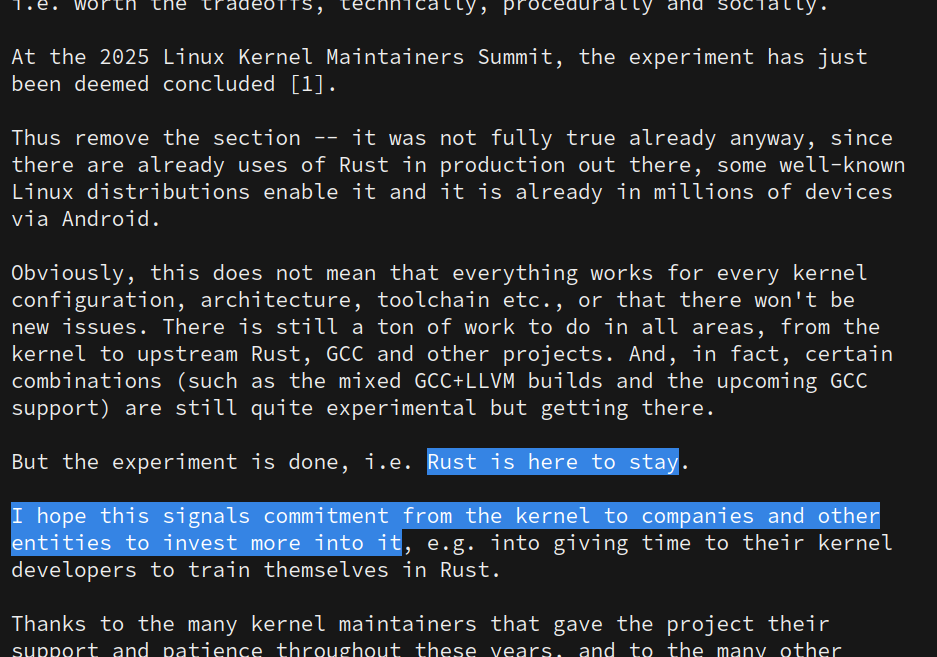 I hope this signals commitment from the kernel to companies and other entities to invest more into it, e.g. into giving time to their kernel developers to train themselves in Rust. […]""