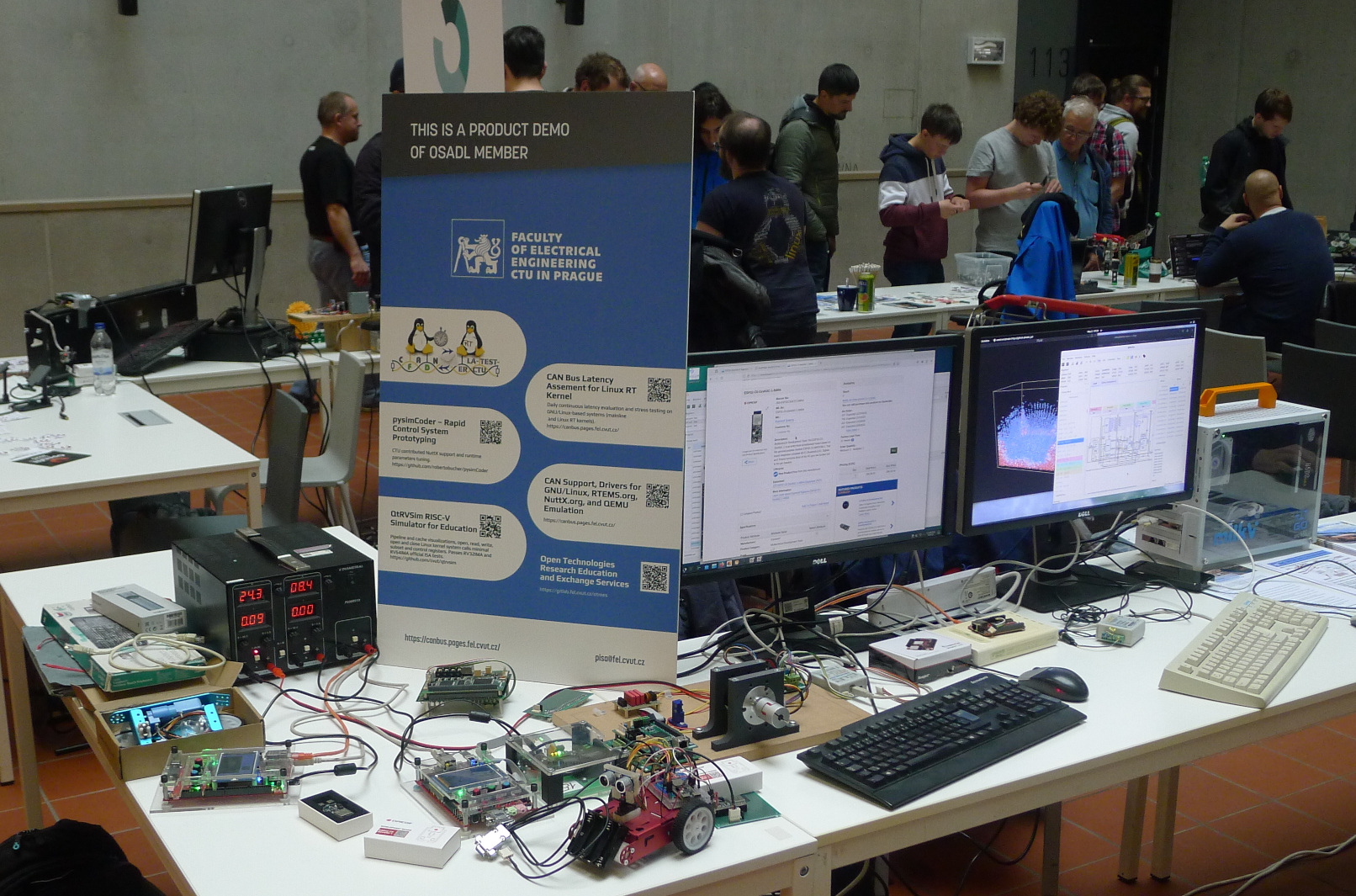 OTREES #cvut booth at #LinuxDays 2025 presenting our CAN/CAN FD projects for #Linux, #NuttX, #FPGA and #RTEMS. SaMoCon motion control platform driven by pysimCoder rapid prototyping solution for #NuttX with online monitoring and parameters tuning and update uploads through silicon-heaven and NXboot integrated in the frame of Štěpán Pressl’s #GSoC 2025 (will be presented in detail on NuttX Workshop October 16 and 17). More on the booth: #Espressif based kits running NuttX (ICE-V Wireless, see our PMSM project, #ESP32C6 with M-bot platform), AMD/Xilinx Zynq MZ_APO running Linux and #RTEMS, PolarFire SoC, Milk-V Pioneer 64 core 64-bit #RISCV system running #QtRvSim (for CompArch education), #CHROMuLAN data acquisition over uLAN driver, LX_RoCoN system used for ESA projects and lot more to see at our booth.